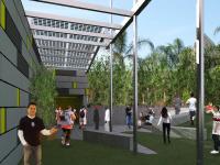 The design for the Animo Film and Theatre Arts Charter High School is built upon progressive and didactic ideas concerning both sustainability and education. The design intends to provoke inquiry within students leading them to question the notion of sustainability in their lives. Also, just as the students of AFTA venture outside the classroom to learn from real-world sources, the building figuratively turns itself inside out. The classrooms have become secondary while the reconfigurable central performance space and exterior amphitheater take on primary roles in the students’ education.