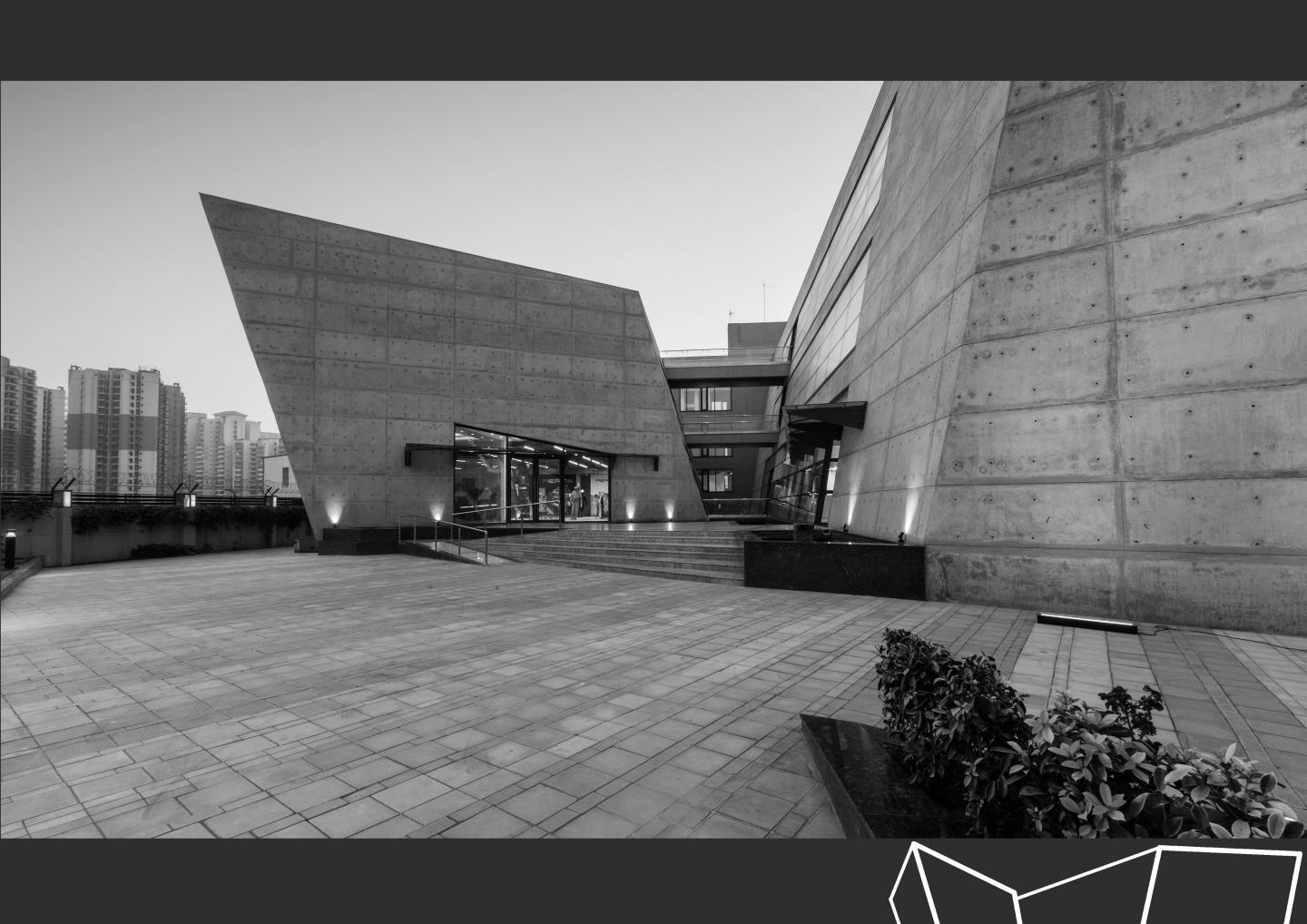 All the built blocks share a common central water feature, connecting them visually, whereas the inclined building blocks are physically connected at all levels with bridges over the said water feature. Selective use of corten steel in peripheral structures adds to the monolith concept of the building.