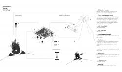 With the use of smart technology, KEPOS allows users to get involved through social media and in public space. Plants, soil, and air are equipped with sensor devices, connected to microprocessors that compute the input data to control the output systems. Three interlocking communication circuits orchestrate the performance; watering, text messaging, and lighting performance. The watering circuit senses humidity of soil and air to instantaneously transmit the information of watering request via social media to the community subscribed. However, response requires physical presence and tactile sense by means of a capacitive touch sensing installation that activates a water pump. Dripping water saturates the soil until the humidity sensor communicates the right amount of moisture to a lighting circuit, re-adjusting the colours in animated LED stripes to visualise the state of soil and plants.