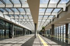 The curved form peaked over the main the area provides eligible conditions for the travellers while waiting for their train. Visitors enter a high atrium surrounded with 3 terraced floors housing security points, ticket offices, leisure areas, food courts, duty free shops and office units. The building is accessible by car, to the drop off in the very middle, at the platform level and by the pedestrians.