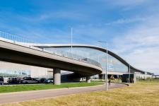 Articulating the urban space, the structure of the roof is considered as a major element in building the space. The monolithic roof system is an integral part of the structure of the station. The roof formed of three continuous plates, which run from one end to the other, as wavy lines with intervals between them.The main bearing construction of the light-weight roof is steel; the design refined to optimize strength and stiffness, and provides an economical yet durable configuration with good resistance against weather conditions. The openings are glass covered only above the main station building, Cantilevered roof structure create a spectacular effect while granting a long protective, but still open-air waiting zone, extending to both ends.