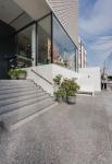 Different uses are stacked vertically across five levels. The entrance threshold announces two routes from the street: one to the retail areas and another segregated “inner street”. The latter allows passers-by to enter through a botanical garden at the end of the plot that takes up the whole height of the building. This promenade ends at the cafeteria on the last level. It’s a space contained on the sides but open to the sky. The first three levels of the building -devoted to retail and exhibition spaces- are also linked by open stairs encompassing double and triple heights.