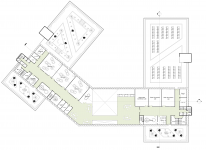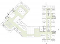 The two wings are joined together by another wing that consists of an amphitheater. It has a gathering and interaction space, covered with a large atrium, which forms the primary approach and address to the building. This wing functionally connects the wings together across the three levels of the building, and is also an expressive architectural figure of collaboration and connectivity.