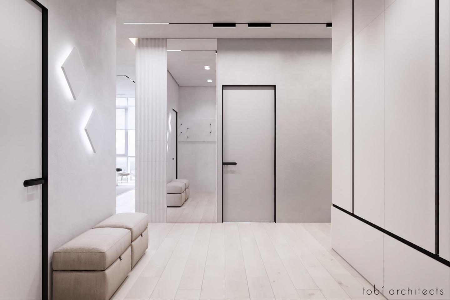 The square shape of the apartment plan with windows on one side made the rooms quite elongated, but this did not prevent to arrange all functions ergonomically. In the back of the apartment are arranged bathrooms, a wardrobe, and a hallway.