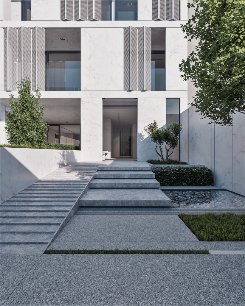The façade is designed based on composition of balconies’ open and semi-open spaces beside solid panels’ pattern.