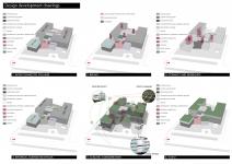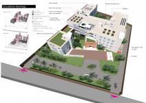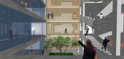 The sunken recreational corridor forces the hot western wind to flow down, to get cooled and to get circulated within the building through narrow volumes (venturi affect) as it rises. Roof top farming has been proposed on the roof to cool the interior office spaces, as well as provide social spaces. Rain water harvesting and flushing tanks are proposed for reuse of water for flushing and gardening in the campus. Solar panels are placed on the roof to generate electricity.