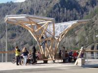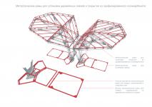 Renewal of viewing platform includes creation of canopy with benches, reconstruction of railings and laying of paving slabs. The site sets the task for object to become a natural part of Divnogorsk riverfront with its pathos and natural scale. In our opinion, only functional architecture whose visual image has the qualities of the art-object is able to achieve this result. Butterfly-structured canopy was created for the place using “ADM” structural building system. We aim to create a shape suitable to the spirit of the place, but emerging numerous associations. Different angles of perception of canopy cause different visual images from falcon hovering over the Yenisei River to butterfly wings, from the leaf of a plant to the image of the flower, and at the same time the shape resonates with the background of the mountains on the opposite bank of the river.
