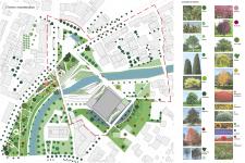 different paths and views; the southern part presents a new mixed use building and a park next to