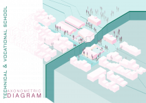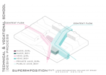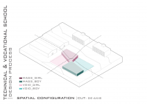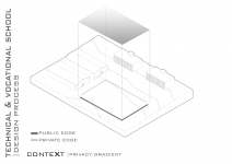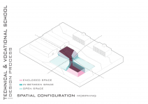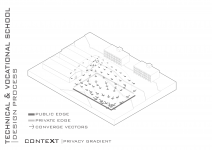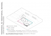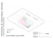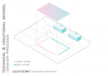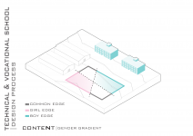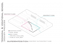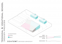 "Technical & Vocational High School" is defined as a non-mixed high school but for both sexes simultaneously located in a educational site populated with boys high schools and also Indoor sports halls. In this contradictory concept, the design strategy is mainly based on the way the space is able to induce dynamical bifurcation while having some common spaces like workshops and work spaces to be used for both genders on the basis of time-sharing system. So the correlation between gender gradient as content and privacy gradient as context is represented by superimposing of content-cut and context-flow. In this dialectic, gender zoning is defined, spatial configuration is developed and the morph is generated/regenerated.