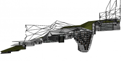the main concept was to camouflage hide the bunker physically underground with a few spaces semi-underground to give hope for the bunker users to connect and see the outside and hide the bunker by creating a fake function above ground like plazas ,gardens, connection path between two levels and the spaces that are above ground will be restaurant,library.the form was inspired from the site itself (the cracked shaded path with the water tunnels similar to the valley concept,and the shell is an abstract of the lime stone shape pointed from the mountains in the site and all of that held by the trussed structure which gives the impression of securing the whole thing and dragging it from the inside of the mountain to overlook the wonders of Al-Shita valley.