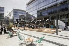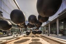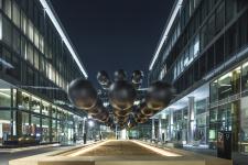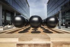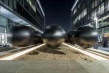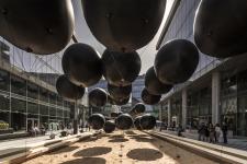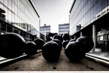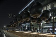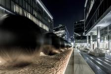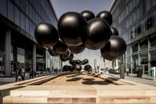 The floating spheres are the foundational element of the city (ref. Dubai’s oil), but at the same time its Achilles heel. Much like the bubble of wealth created by the finite resource of oil, the city might burst or float away and it needs ballasts to anchor it firmly on the ground. The economic stability of the Middle east is granted by its foreign investments, that are here represented with black foam “London Bricks” we especially crafted for this installation.