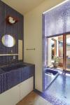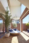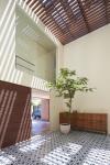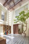 Our overall guiding image was of light being encapsulated in the center of the house. To achieve this, we created a central void with a skylight above it, and windows on the first and second floors facing the void. Sunlight and reflected light enter this central living room from various directions so that the atmosphere of the interior shifts subtly throughout the year. All the rooms in the house are linked through the void above the living room. On the first floor, which contains the rooms where the family gathers, large sliding glass doors face the southern side of the property, connecting interior and exterior spaces. The bathroom is also connected to an outdoor terrace and second living room, which contributes to the resort-like atmosphere. The aroma salon and bedrooms are located on the second floor, and the salon is accessible directly from the entryway to better accommodate frequent clients. Textured finishes are used throughout the house, including antique brick on the exterior walls, custom-made tiles on the living room floor, glass tiles in the bathroom, and brass fixtures.