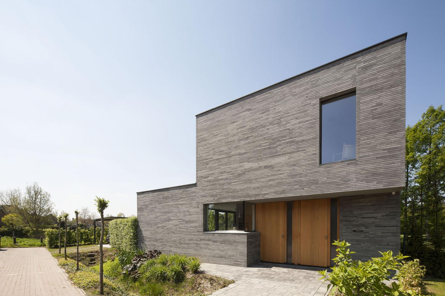 Due to the sober design, the house is not too present. She is visually restrained in the surroundings as an average farmhouse in this neighborhood does. However, the long concrete stones, in different shades of grey, create a vivid appearance and is anything but rural. The minimum number of different materials ensures a modern modest appearance.