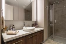Gonye Proje Tasarim used ceramics with natural stone look and wall papers in the floorings and walls of the bathrooms in a balanced manner, in order to provide a warm effect in the wet ground areas; and again used wooden-like cupboard doors in the furniture and mirrors with cupboards so as to increase the storage area in the bathrooms.