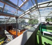 The atrium makes up the energetic hart of the new building; to which the classrooms of the existing building are situated. A breakthrough in the wall at the first floor connects the new building to the existing ones. Wide staircases guarantee that the new classrooms can be reached easily and lots of workspaces are scattered all around the building. The gradual layout provides a lot of contact and overview. The natural appearance and the large amounts of natural light and air create a calm and relaxing atmosphere.