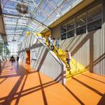 The classroom volume has a convenient layout, hallways are alternated with squares on which the entries to the classrooms and sanitary facilities are located. These dynamic circulation areas are designed as explosions of colour. The way to the classroom from the atrium becomes a enervating experience, which is a welcome variation between classes.