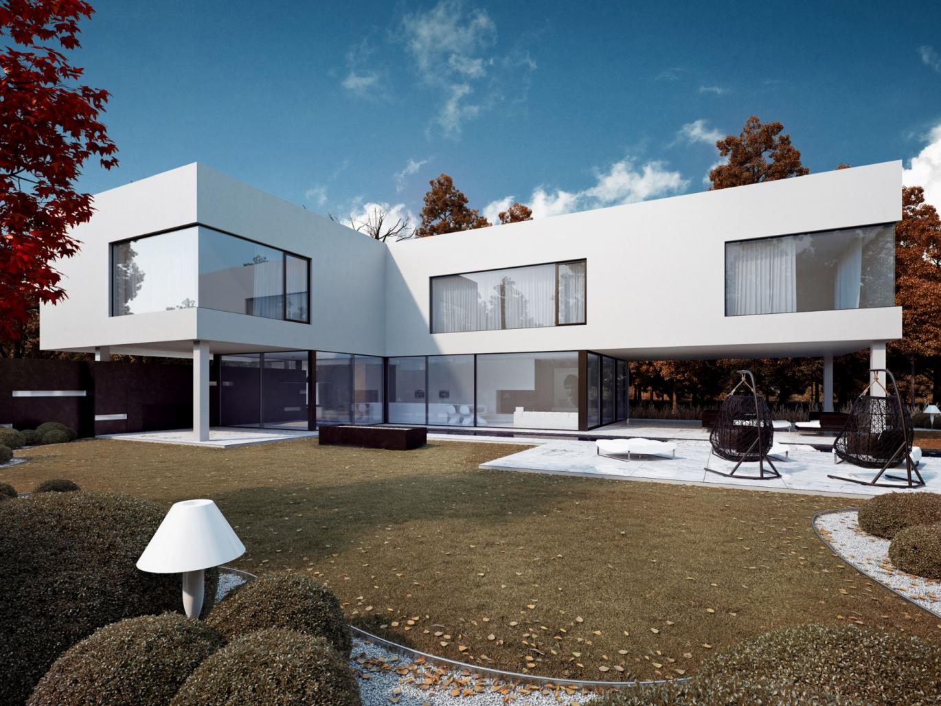 Single-family house in the form of a homogeneous solid in the shape of the "L" letter. Despite the large volume of the building, it gives the impression of light one. It's because of large windows and bright colors of elevation. With a glass facade at ground level it seems like a building floating above the ground.