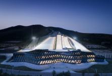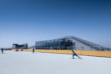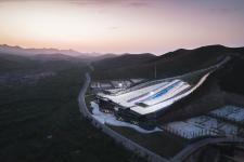 Like wind blowing against strips of paper, the piste hugs closely to the mountain ridge like a wave of white moving downwards. The south side of the wave corresponds to the large indoor space below, while the north side serves as the resort entrance, and other circulation. Where the wave curls slightly upwards at the second and third floors, an open terrace space is defined for visitors to relax at the bottom of the piste. Observation stands on top of the third floor offers visitors the best possible spectator positions to watch the field.