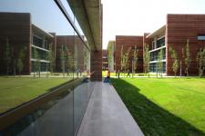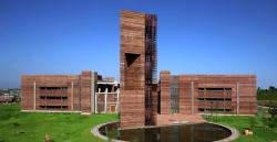 The Telenor Office creates a new work space paradigm, whose principles are based around Sustainability, Context, Land and Work place experience. The Campus has a distinct Architecture which is planned around stepwells; woven together through an internal street which changes in width and volume as it staggers around the complex. The material palette used on the façade creates a dialogue between the building, the contextual landscape and the surrounding urban fabric. The stabilized rammed earth walls strongly depict the natural hues of local soil. Local stone is used in the stepwell and screens which filter the harsh sun. A unique Communications Tower feature acts as a symbol a beacon to the development