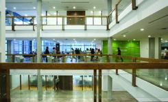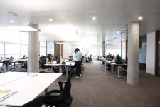 Creating a home for the county’s second largest and fastest growing mobile service provider brought its own set of challenges. The architecture and the interior planning questions the strong hierarchical system ever present in the local corporate sector by introducing open plan work zones with shared social hubs. A key aspect of the conceptual planning has been the Telenor work place model where social, physical and technological interaction is encouraged in a variety of ways. The office campus is planned around the stepwells, woven together through an internal street which changes in width and volume as it staggers around the complex. The courts are integral to the street and work zones, where people can work, meet and eat. This same seamless flow of space exists between the street and the work zones; on all the various floor levels.
