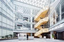 At the end of the atrium, there is a sculptural wooden stair that connects the 1st floor to 4th floor. As the key to traffic flow, the wooden stair activates all spaces and becomes an independent unique space where people enjoy walking. Everyone from 1st floor to 4th floor will pass through each office area, thus artificially creating opportunities for communication. Through the exchange of information between each other rapidly, employees can inspire more creativity.