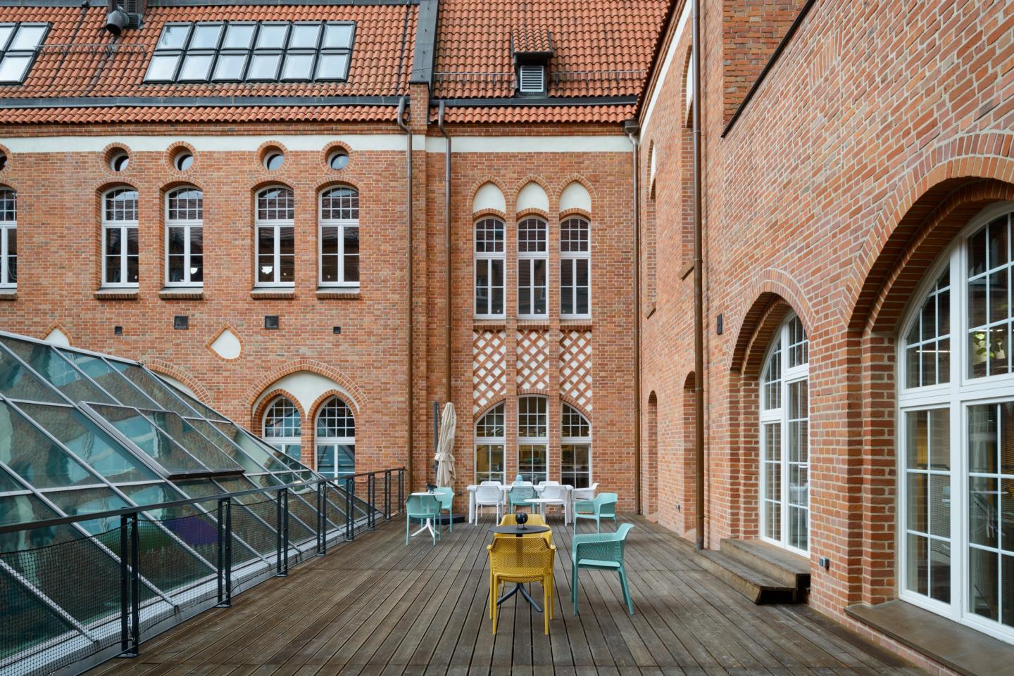 Combining the old and the new takes place on many levels. The interior fosters a pro-social atmosphere and the dynamics of creative work. We can find there a large common space with mezzanines and a kitchen - something on the border between a cafe and a playroom, or a chilllout-room. A place where you can work nicely and spend your free time productively. From this space you can enter a 500-meter private terrace located in the patio of the old post office building, bringing to mind a beach ambience and the nostalgia of old monasteries and cathedrals. It gives a unique atmosphere – modernity is mixed with authenticity. Balance that favors work. The value that cannot be overestimated.