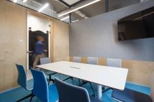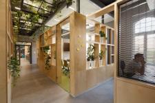 Office rooms extend around the patio. This is a modern response to open space. The space is quasi-open but divided by ecological plywood walls into smaller annexes that provide focus and peace of mind at work. Ecological design is an important factor here. According to the research, materials such as wood and wool act as a stress-reducing buffer and have a positive impact on the well-being of employees.