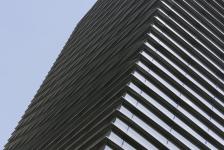 The building is composed of a fourteen-story concrete frame clad with a high-performance curtain wall, and includes four levels of underground parking. The tower’s eccentrically organized core within the narrow building footprint and its unusually high ceilings create generous spaces that take advantage of unobstructed views and allow natural light to penetrate deeply into all tenant areas. Deep horizontal mullions on the exterior control solar gain, while interior operable wood louvers, integral to the curtain wall system, give tenants individual daylight control. The tower’s tall, narrow proportions and the scale and repetition of the horizontal bands of glass and wood achieve a level of abstraction that lends stature to the project.