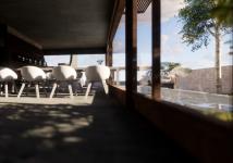 The material palette focuses on blending the residence with the site . Hence earthy colors and Board-formed concrete is utilized. The dramatic play of light and shadows enables the residence to harmonize with the existing terrain.