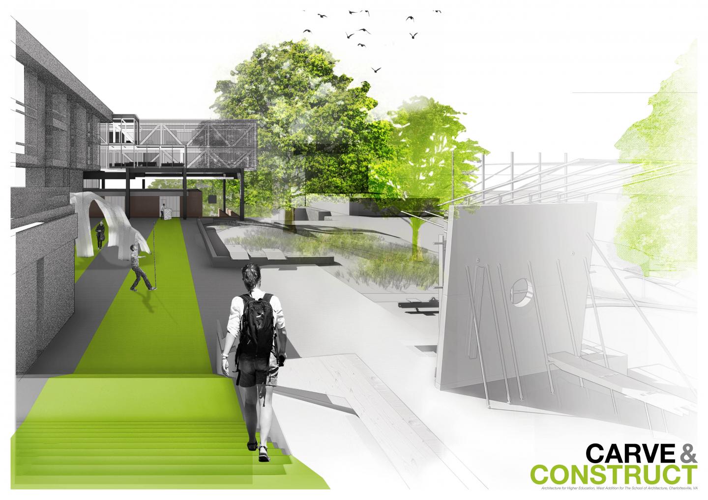 Due to the UVA School of Architecture’s emergent needs and expansion aims over the next five years, the idea of an addition has been an issue heavily discussed among faculty and administration. In this sense, the west addition project for Campbell Hall aims to provide the necessary spaces for the faculty, students, researchers and fabrication while proposing a achievable phased scheme. The project creates an anchor for fabrication and collaboration spaces and facilitate a seamless flow between main programs of learning, researching and faculty spaces. In this scheme, Campbell Hall, containing the main studio spaces, is seen as the crossroads of all activity and a permeable block. It feeds from research, exhibition, making, collaboration, or faculty hubs of the school which can easily diffuse in and out as per the flexible nature of the contemporary architectural education.