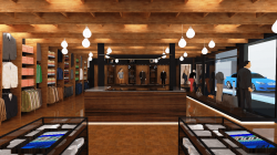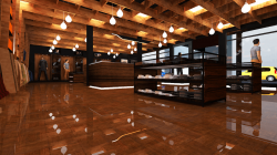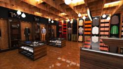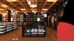 The designed area is 137 sqm . There are 2 column in the middle of the space. The teller section is designed around these columns in the middle of the space. The wooden grid created in the ceiling is transformed into a display area of clothes by being continued on the wall. Spatial integrity was achieved by continuing the wooden grid on the ceiling to the wall. The wooden structure on the ceiling also defines a grill in which the lighting elements are placed. Pendant lamps and barisol are used as lighting elements.
