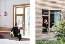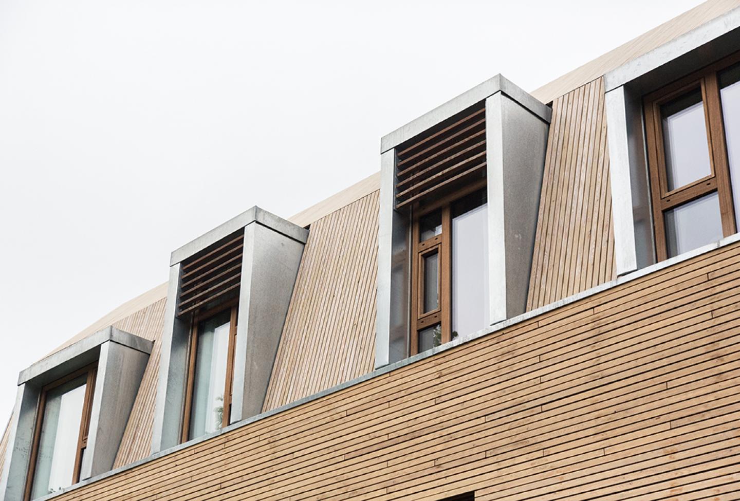 The first phase is the development of 39 hotel rooms divided over three layers. The facade is made from natural and untreated materials which age attractively into the surroundings. Iroko wooden window frames create a beautiful rhythm in the facade which leads up to the clean-cut zinc bay windows on the upper floor.