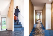 The entrance has a Belgium bluestone floor which flows up the stairs which serve all three levels. The circulation space is directly linked with nature, the stairs have views towards the forest and the hallway is designed like a forest path, with wooden oak walls, rhythmic lights at the entrance doors and a specially designed leaf carpet.