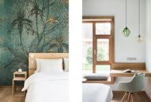 The wooden floor and bespoke tropical wallpaper complete the rooms to a luxurious standard with a warm, natural atmosphere. Wide wooden window frames extend to a desk as well as seating. The glass pendant lights above the desk are also bespoke to the project and corelate with the colours of the wallpaper. The headboard and built-in wardrobe are made from wood to match the nightstands and window frames. The contemporary hexagonal wall tiles in the modern bathroom are inspired from the hexagonal roof patterns in the original villa.