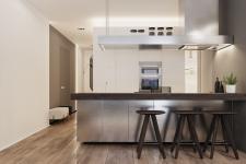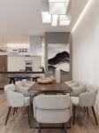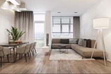 Monochrome colors due to soft diffused lighting from windows and warm lighting above the kitchen and dining room, creates harmony and a special atmosphere of this living room. For the finishing we had chosen a combination of dark wood, chrome-plated kitchen elements and light 3d panels.