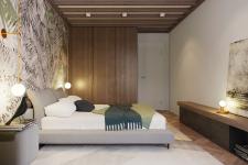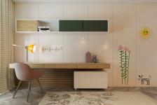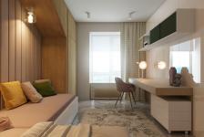 For the bedroom space, we had chosen more minimalistic style, calm colors, soft shapes for the bed and bedside tables, natural materials. One of the interesting solutions for the children’s room was the white glass wall for drawing and a house-shaped bed with a built-in wardrobe.