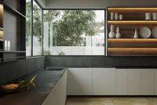 We chose a strict modern kitchen, the black table top which fits well with the black apron Imola Kalahari Black, and open shelves with lighting continue the line of the corner window and add grace to the design of the kitchen.