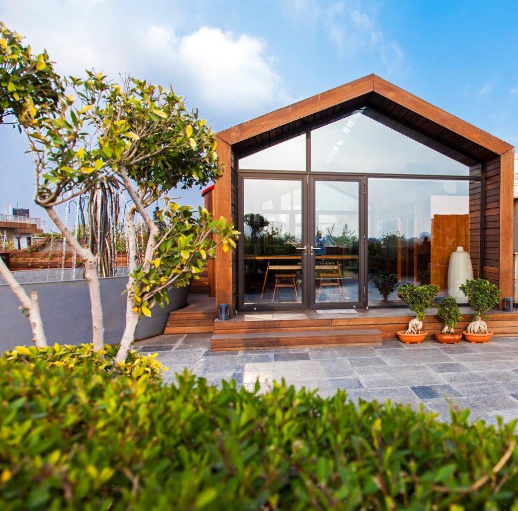 An animated timber and metal spiral staircase was designed to create a statement while punching out and connecting to the timber hut on the terrace. Three kinds of timber i.e. Maple, teak and rosewood contrasting in colour, character and texture weaves through the treads and hut on the top. The comfy abode terminates on the terrace with a giant hut which is meticulously done with attention to details. The cabin is marred by the skylight that allows the light to penetrate but at the same time deconstructs the house makes one realize the form of the hut. Colour and material fill the visual palette, mostly monochromatic, stemming from the