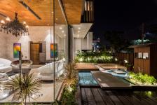 Transparent walls have been used to interconnect the various spaces of the house, and to link them to the outdoors as well. The sitting room located at the front of the house is designed as an extension of the landscape with the cantilevered roof reinforcing the connection of the inside to the outside. The transparent walls are further used to accentuate the presence of the Pool from different areas of the house.