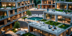 The building is designed to sit on every level in the slope.A dynamic architecture has been created thanks to the architecture that has settled down.The social area between the two housing blocks, the ornamental pool and the swimming pool are designed.It is also possible to observe the green scenery from social areas.Circulation can be ensured by connecting the inner courtyards created at different levels with stairs. Building facade is designed with brut concrete. The combination of brut concrete and wood creates simplicity and richness on the facade.