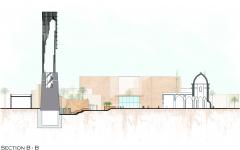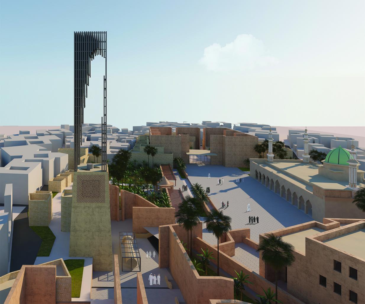 Al-Hadba'a Minaret’s new monument is designed to form the original tilted shape from light/void and steel bars. It is seen as the original form across the city, and especially from the 2 main entrances. As visitors first walk into the project through "The Boulevard" and visit "The Museum of War", they get more familiar with all the facts/war/renovations throughout the years and the destruction of the minaret, therefore when the visitors’ journey resumes through "The Boulevard" and into "Al-Hadba'a Memorial Plaza", the void image of the minaret starts to fade until it can no longer be seen (representing its destruction). The Plaza is where all hopes and dreams of reconstruction rise again, so continuing as a visitor to the rest of the project, (towards the Renovated Nuri Mosque and houses), the void image is reshaped little by little until the minaret’s shape is reformed from the light (representing its reconstruction).