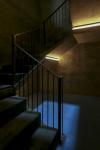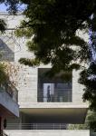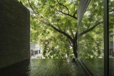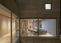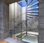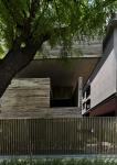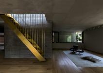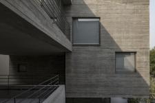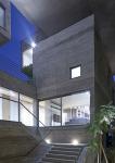 Two exposed concrete cores of similar size integrate staircases/lift/MEPservices and are the only structural support to the building above the stilt area. This nearly indiscernible arrangement reinforces the idea of spatial continuity and porosity of all spaces.