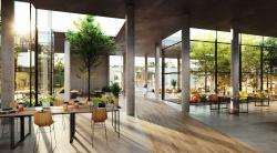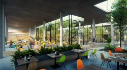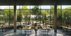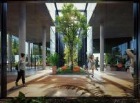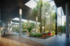 The idea of integrating nature represents itself architecturally in the form of greenhouses and courtyards that penetrate into the two volumes and blurs the distinction between inside and outside. As one of the most important aspects of the project, these transparent boxes allow as much natural light as possible in, aiming to illuminate all the workspaces instead of illuminating the ones next to the windows and leaving the rest for artificial lighting. Furthermore, the use of green provides pleasant eat and work environments and at the same time enables the reach of an infiltrated sunlight. Transparency in the horizontal direction enables a continuous visual relationship, unites the masses in a way despite their physical separation.