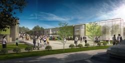 The cafeteria and co-working space form as two separate volumes in order to achieve highly functional areas for the particular purposes of each. The volumes are separated by a plaza which defines the entrances of the two buildings, creates a connection between different levels of the site in which research development areas and Faculty of Business Administration locate. With appropriate dimensions it turns into a plaza that can accommodate variety of events.