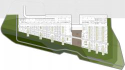 A pedestrian path which runs through the volumes diagonally by taking references from the surrounding streets is introduced; so that the physical relationship with the site is enhanced. The path also differentiates greenhouses and courtyards, and each gains different qualities while offering use for co-working and cafeteria purposes. Moreover, service areas are designed as linear compact masses and attached to the northern side of the buildings, not disturbing the main spaces and hindering the sunlight.