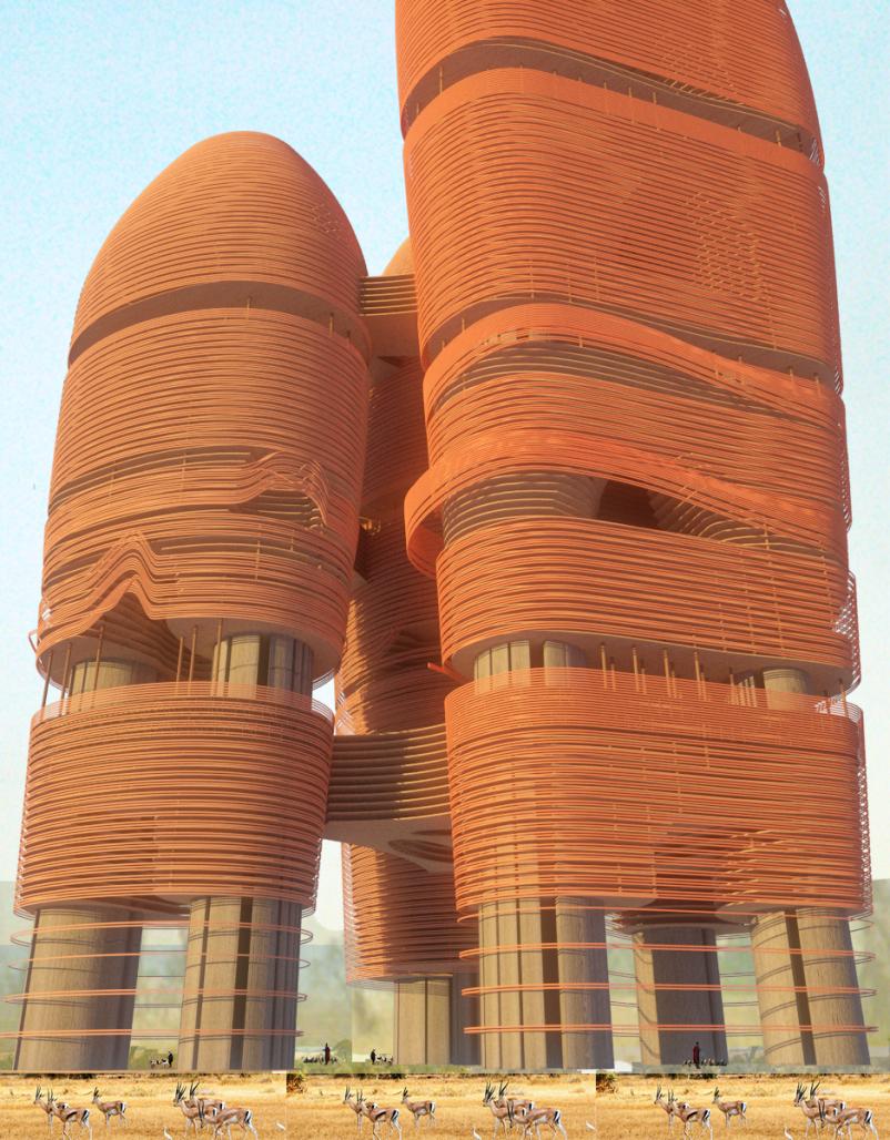 With a 40% global population increase expected in just the next 30 years, and coastal cities becoming uninhabitable through sea level rises and climate change, just imagine how much worse this situation will get. Our city is located in Eastern Equatoria, an underdeveloped grassland region of South Sudan. Being located near the equator, the site receives high levels of solar energy and high-angle sunlight hours each day. At a maximum height of 650m, our building design aims to give back to the skyscraper what was taken from community life in the race to the top. The body of each building pushes outward as it rises from the ground, creating self-shading for the lower levels on the exterior, and protection from the harsh overhead sun at the base. On the inside, larger floor plates are created at these mid-rise levels. We used this change in size to push main programs to the exterior and hollow out the center of each building, creating a large atrium. The typical central core was split up and distributed into two or three structural service cores within the building. With this central atrium space we are able to draw additional light in, and develop shared community spaces around it. Stack- and cross-ventilation encouraged throughout the building. The form and orientation of each building and their clustered organization protect the structures from harsh, driving rains in the wet season while guiding cool summer breezes into space. A number of solar studies were done to ascertain the best placement of openings and sky gardens so as to maximize light penetration. These openings, along with the community lobbies used as a zoning mark at each structural outrigger, allow for spaces where residents can meet each other and have activities similar to the experience in a city park of today.