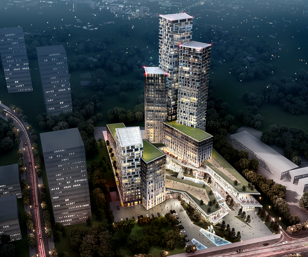 Main focus of the design is to seperate commercial and residential through a green base to provide a quite space away from the crowds and traffic. Commercial units are collected around the inner courtyard, which is directly connected to the main axe of the city, while housing units are placed on the green base seperated from commercial ground.