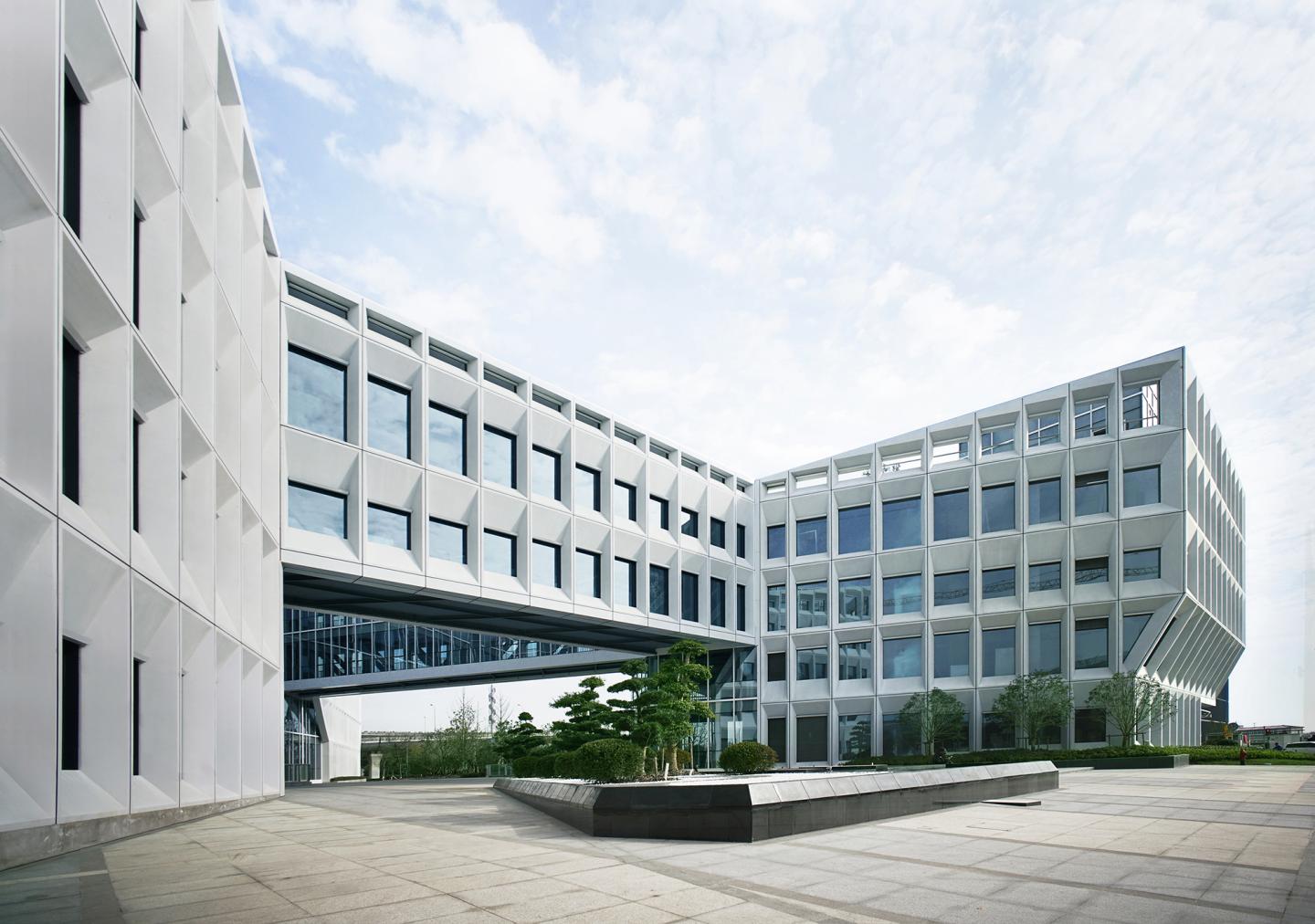 Shanghai Baoye Center is part of the phase-2 urban development scheme for the new Central Business District in Hongqiao, a rapidly developing piece of western Shanghai. The location of the project puts it at the center of car, train, and jet transportation, and is in fact the last building one sees before entering the busy Hongqiao High-Speed Rail Terminal from the south by bullet train, granting the project a significant urban presence.The site has several challenging conditions: sandwiched by two city-designated temporary green spaces into an L shape, with a 60% frontage ratio requirement to the east, west and south, and a 24m tall highway overpass running adjacent to its north face, the building must respond to a maximum FAR of 1.60 and a height of 24m.