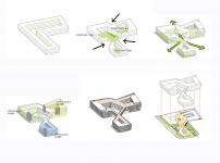 The enclosing corridors also attract people into the central courtyard and then lead people entering three office buildings. The lift operation creates a depressive space, which creates a spatial sequence as open-depress-open again when people walking from outside via three lifted corridor into the center courtyard. This sequence will indicate people of a sense of entering and creating richer spatial experience in the limited site. In this way, form, circulation and the spatial sequence are highly unified.