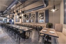Within the 150 square meter restaurant, sky-blue floor tiles, pastel yellows matching with the colours of